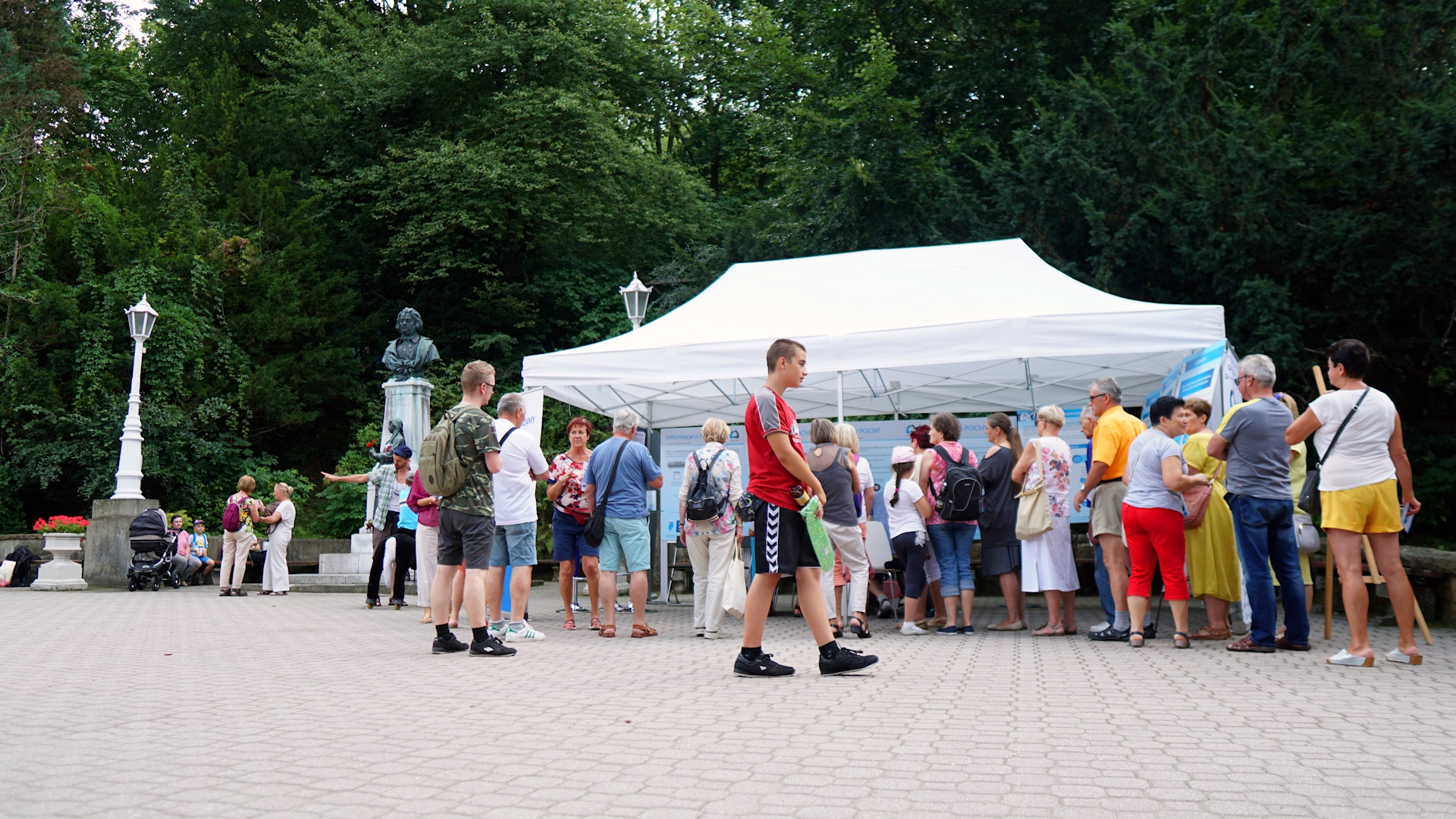 W ostatni piątek, 09 sierpnia, przed pomnikiem Adama Mickiewicza przedstawiciele kampanii Płuca Polski wraz z wykwalifikowanymi pielęgniarkami oferowali bezpłatne testy pojemności płuc – spirometrię. Badanie to pomaga ocenić możliwość istnienia przewlekłej obturacyjnej choroby płuc (POChP) oraz idiopatycznego włóknienia płuc (IPF). Zainteresowanie akcją przeszło oczekiwania organizatorów. Badaniu poddało się ponad 140 osób. Byli to zarówno młodsi mieszkańcy i turyści, jak i seniorzy korzystający z sanatoriów.