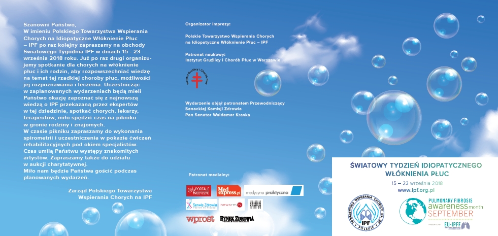 22 września, w Instytucie Gruźlicy i Chorób Płuc w Warszawie, odbędzie się mini sympozjum pt. „Kompleksowa opieka nad chorym na włóknienie płuc” a dzień później, 23 września Piknik IPF w Kuźni Golfa na Polach Mokotowskich. Wydarzenia te będą doskonałą okazją do spotkania i wymiany doświadczeń pacjentów, lekarzy i ekspertów w dziedzinie chorób płuc. W trakcie pikniku uczestnicy i zaproszeni goście będą mieli możliwość wykonania bezpłatnych, profilaktycznych badań spirometrycznych oraz konsultacji z lekarzami, rehabilitantami i dietetykami. W trakcie trwania spotkania odbędzie się pokaz ćwiczeń oddechowych, przeprowadzona zostanie także aukcja charytatywna, a czas umilą występy artystyczne.